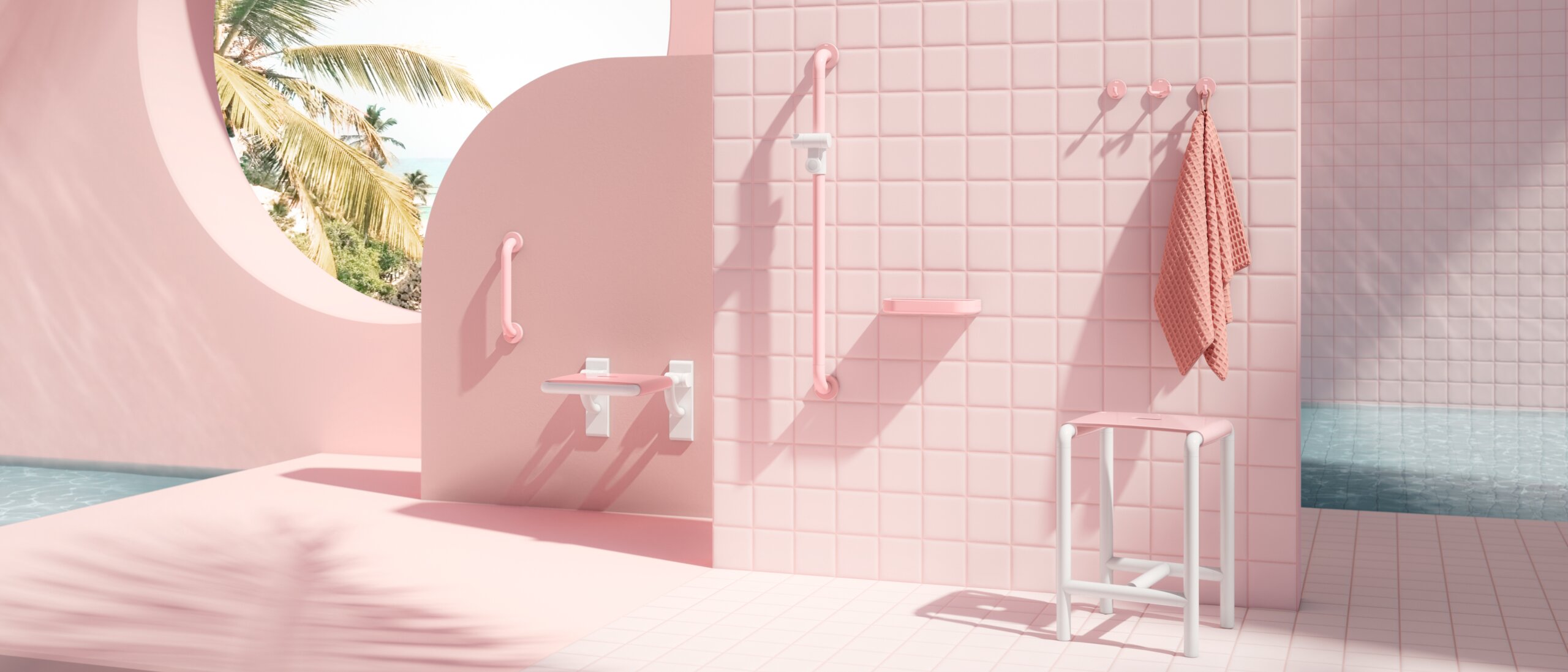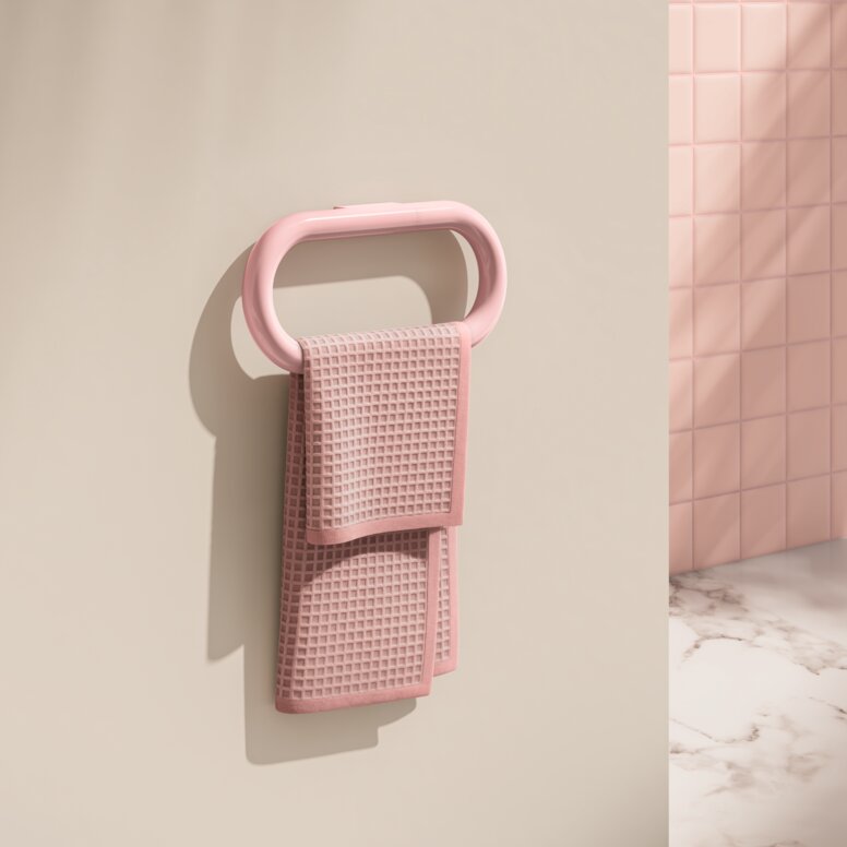Zentrales Element sind rosa Badezimmer-Accessoires, die Funktionalität und Emotion auf neue Weise vereinen – für ArchitektInnen, PlanerInnen und GestalterInnen, die inklusive Räume mit Charakter schaffen wollen.