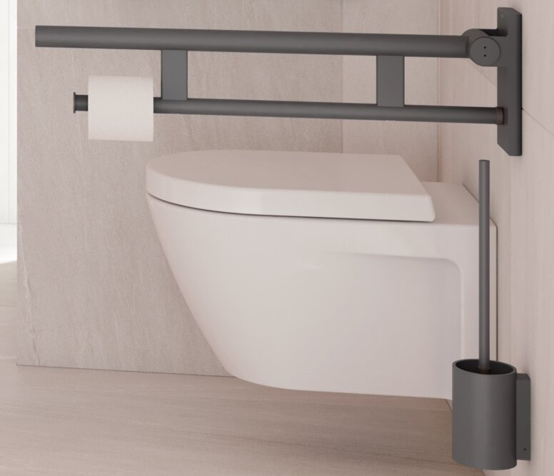 • Stützklappgriffe: Sie bieten Stabilität beim Umsetzen und Aufrichten – ein zentraler Aspekt in einem rollstuhlgerechten Bad. HEWI Stützklappgriffe sind ergonomisch geformt, sicher greifbar und besonders belastbar. Der HEWI Stützklappgriff Duo verfügt über eine zweite Griffebene – ideal zum seitlichen Eindrehen und Umsetzen. Zusatzfunktionen wie ein integrierter WC-Papierhalter oder eine Spülauslösung lassen sich direkt am Griff anbringen.