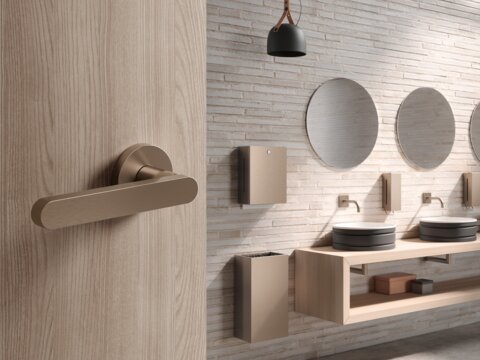 Die Beschläge aus System 111 sind sowohl aus hochglänzendem Polyamid als auch aus matt geschliffenem Edelstahl erhältlich und ergänzen die Sanitärsysteme optimal. System 111 stellt auch an hochfrequentierten Klassentüren eine besonders belastbare Beschlaglösung dar.
