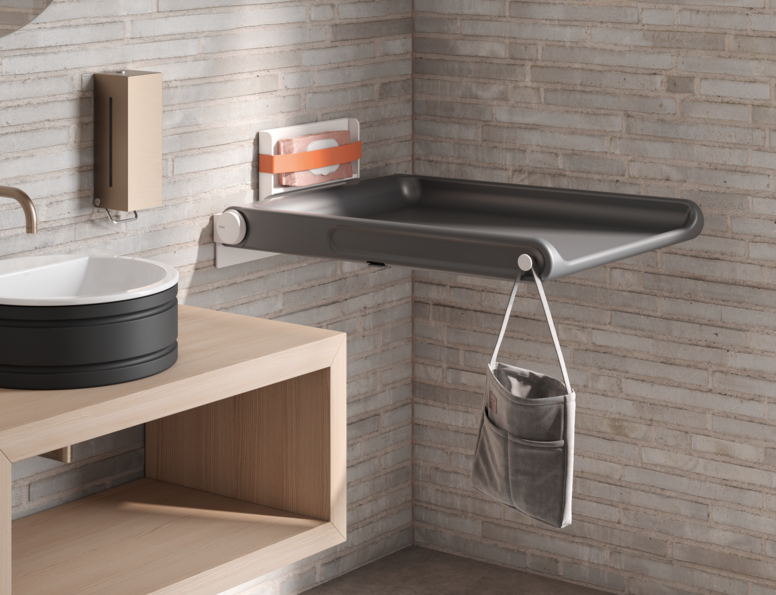 The new HEWI baby changing table combines an easy-to-clean lying surface made of PUR foam in iron grey with robust metal components in matt grain white. The braked fold-down function enables smooth handling, while side hooks and a clamp compartment offer additional comfort and convenience. The changing table combines the highest safety standards and comfortable handling with a modern design that blends seamlessly into public sanitary areas. The baby changing table was designed by Holscher Design, a renowned and award-winning strategic product design agency from Denmark with over 50 years of experience.