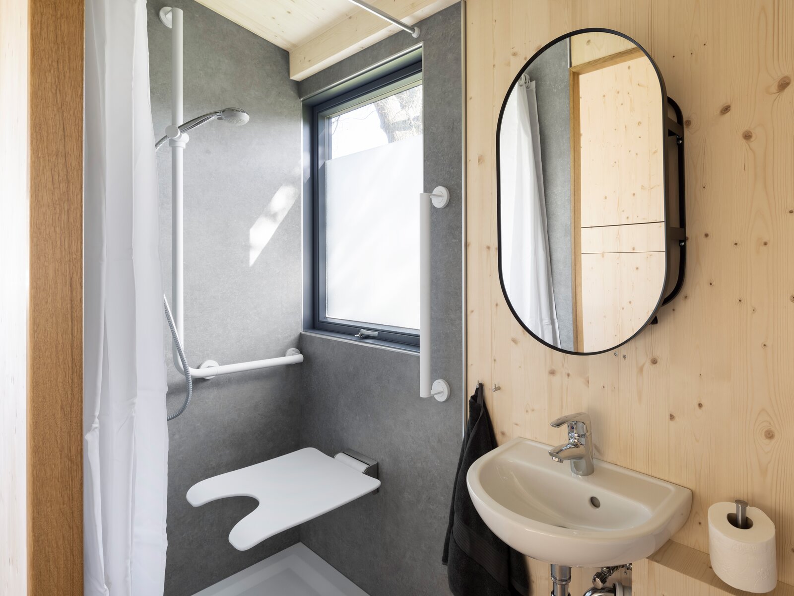 Christian Bock: It was particularly important to us that the Tiny Rolli House is wheelchair accessible but still retains the charm of a tiny house. It should in no way have a "nursing home" or "hospital" feel. At the same time, there should be important functions so that Mr Conrad can move around the tiny house independently. These include, for example, grab rails or a shower seat in the bathroom. However, we did not want to focus on his deficits, but rather to support him in the best possible way. The Tiny Rolli House should have a positive influence on its residents. The appearance and the design language should not be neglected. A special feature of the house is certainly the ramp that allows wheelchair users to access the tiny house comfortably. For a good tyre grip, we have laid a designer floor. A pull-out refrigerator, a wheelchair accessible heated table and a sink and stove-top within easy reach provide the desired living comfort. The small area has even proved to be an advantage for Mr Conrad: he has all the most important things in a small space and just has to turn around. From his bed, he can pull himself straight to the toilet without using his wheelchair.