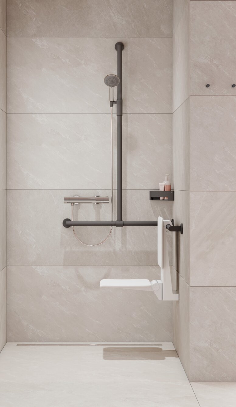 Inadequate spatial planning is a crucial mistake in barrier-free bathroom conversions. Having plenty of room is particularly important when wheelchairs, walkers or carers are involved in personal hygiene routines. Sufficient space to move around and be with other people are essential for ensuring optimum support for your customers’ individual everyday lives. In addition to an optimised floor plan, the strategic placement of aids such as hinged support rails is crucial.