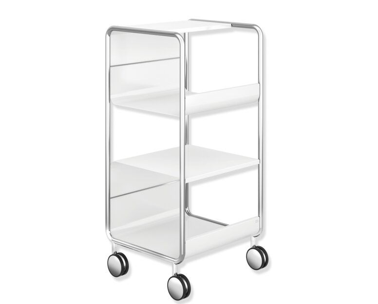 The HEWI additional trolley ideally complements the shelves mentioned above, in a washbasin area. It can be conveniently pushed to where it’s needed and offers flexible, convenient storage space. Bathroom utensils that are less frequently used can be stored in it and used when needed. The lockable wheels ensure a safe and firm stand. The trolley is available with powder-coated surfaces in high-gloss white or matt black with elegant chrome elements. In terms of design and function, the HEWI side trolley is an innovative washroom solution that fits perfectly into the accessible washbasin area.