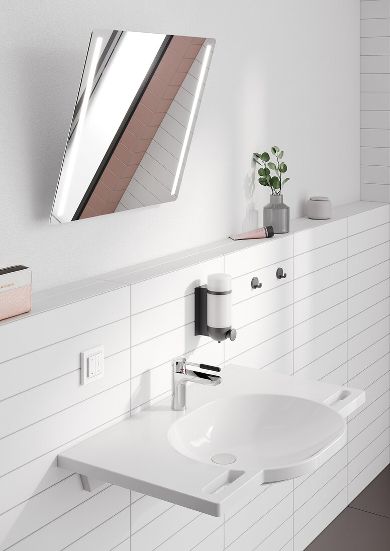 Les miroirs HEWI complètent l’ambiance de n’importe quelle salle de bain. L’offre élargie comprend des miroirs inclinables avec cadre noir et blanc, des miroirs lumineux à LED innovants avec éléments de commande rétroéclairés ainsi qu’un nouveau miroir inclinable motorisé.