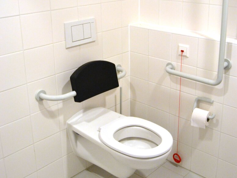 LifeSystem van HEWI werd gebruikt in de badkamer. Inklapbare handgrepen op de wastafel en het toilet bieden steun en helpen bij het verplaatsen. De douche heeft een leuning. Dit biedt het voordeel dat het kan worden gebruikt als een stabiele houder en dat er indien nodig een douchezitje in kan worden gehaakt. Alles in de badkamer is zo ontworpen dat rolstoelgebruikers er zonder problemen gebruik van kunnen maken: de wastafel kan eronder worden geschoven, het toilet heeft een rugleuning, en er is ook een opklapbare steungreep met een tweede greepniveau, waardoor het gemakkelijker wordt om van de rolstoel naar het toilet te gaan