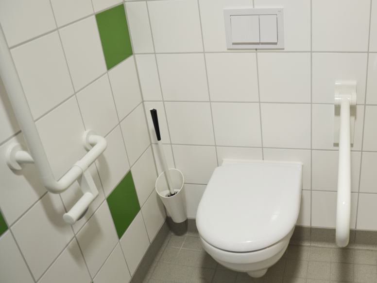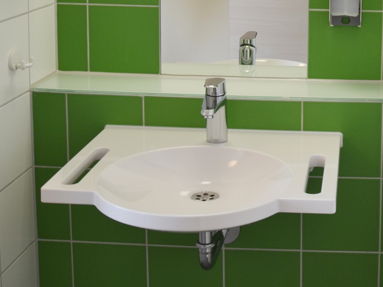 Het bieden van zorg op een menselijke manier, wanneer dat nodig is, is een andere belangrijke benadering. Daartoe wordt in het concept bijzondere nadruk gelegd op de persoonlijke levenssfeer en de intimiteit van het individu. Om deze reden heeft elk appartement een badkamer. Deze zijn ontworpen om de gebruiker steun te bieden. De wastafel heeft geïntegreerde handgrepen, zodat u erop kunt leunen of u met een rolstoel kunt optrekken. De douche en het toilet zijn uitgerust met ondersteuningssystemen die veiligheid bieden en de beweging ondersteunen. In de douche werd ook een opklapbaar douchezitje geïnstalleerd. Deze kan tegen de muur worden geklapt om ruimte te besparen wanneer hij niet wordt gebruikt. Door het terughoudende ontwerp worden de barrièrevrije producten niet als hinderlijk ervaren wanneer zij niet in gebruik zijn