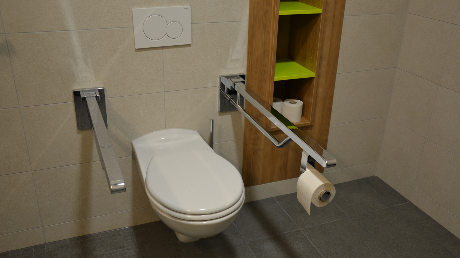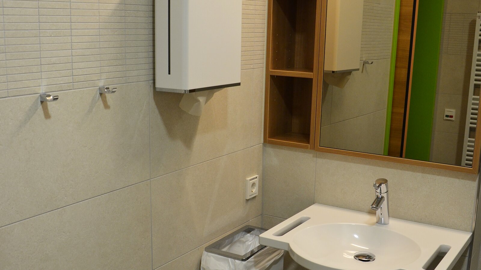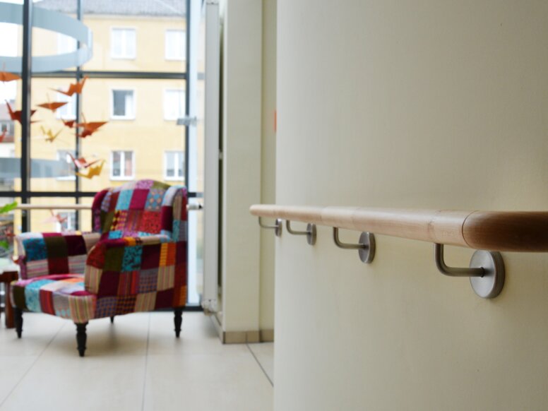 Het hospice telt tien kamers - bij de inrichting werd veel belang gehecht aan een huiselijke sfeer. Zo hebben de kamers een eigen toegang tot de tuin. De badkamers werden drempelvrij ontworpen. Ook hier ligt de nadruk op het huiselijke karakter: bij de verchroomde sanitaire accessoires voor de WC werden verchroomde draaggrepen gekozen. De wasbak heeft geïntegreerde handgrepen die dienen om de gebruiker naar de wasbak toe te trekken en deze te stabiliseren. Door zijn ontwerp is de wastafel zowel staand als zittend gemakkelijk te gebruiken, bijvoorbeeld met een rolstoel.