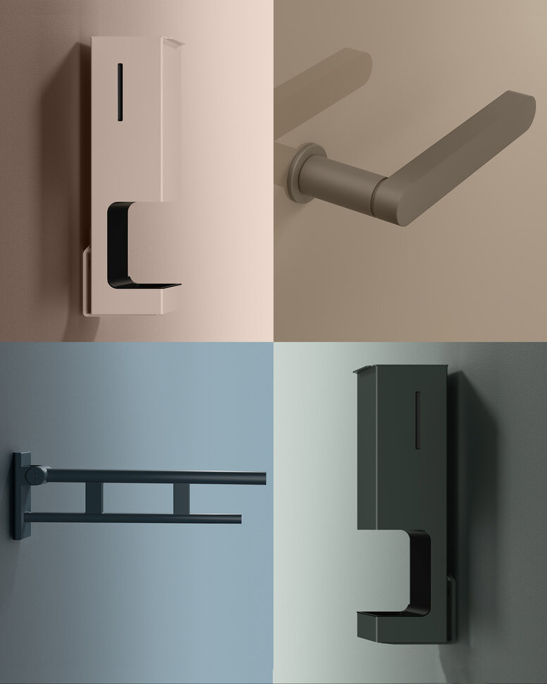 Bij de individueel gepoedercoate sanitaire oplossingen is ook beslag in de gewenste kleur verkrijgbaar. Met grepen uit systeem 270 in combinatie met systeem 900 kunt u unieke ruimteconcepten creëren, van de deur tot de badkamer.