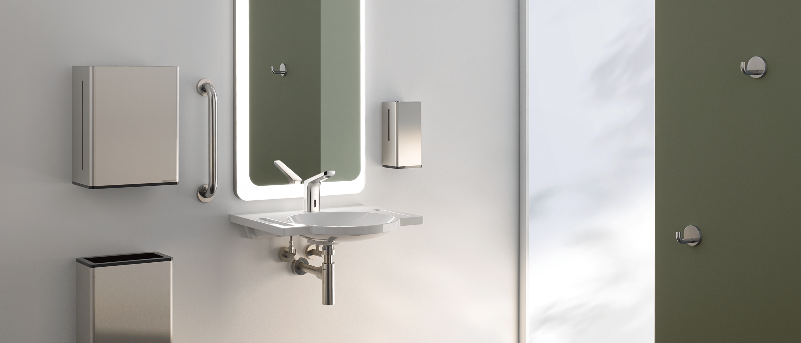 Modellen met geïntegreerde opnamemogelijkheden, hygiënische versies met een opstaande rand en zelfs oplossingen met variabele lengte bieden u een breed scala aan ontwerpmogelijkheden voor de apparatuur. Door hun diepte kunnen barrièrevrije wastafels flexibel worden gebruikt. Ze kunnen staand worden gebruikt - zelfs met krukken of een rollator - maar ook zittend in een rolstoel.