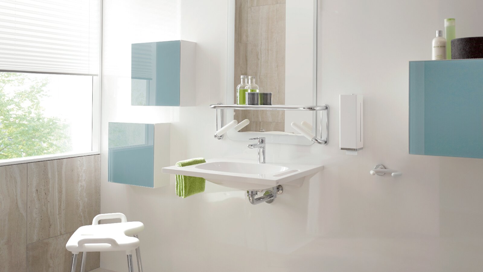 LifeSystem voldoet aan alle behoeften van mensen met beperkte mobiliteit. Een stevige grip dankzij de in de spiegel geïntegreerde handgrepen of de conische vorm van de borstelhouder tonen aan dat bij LifeSystem over elk detail is nagedacht. Douchegordijnen en target="_blank">handrails kunnen naar wens individueel worden aangepast en in verschillende combinaties worden uitgevoerd.