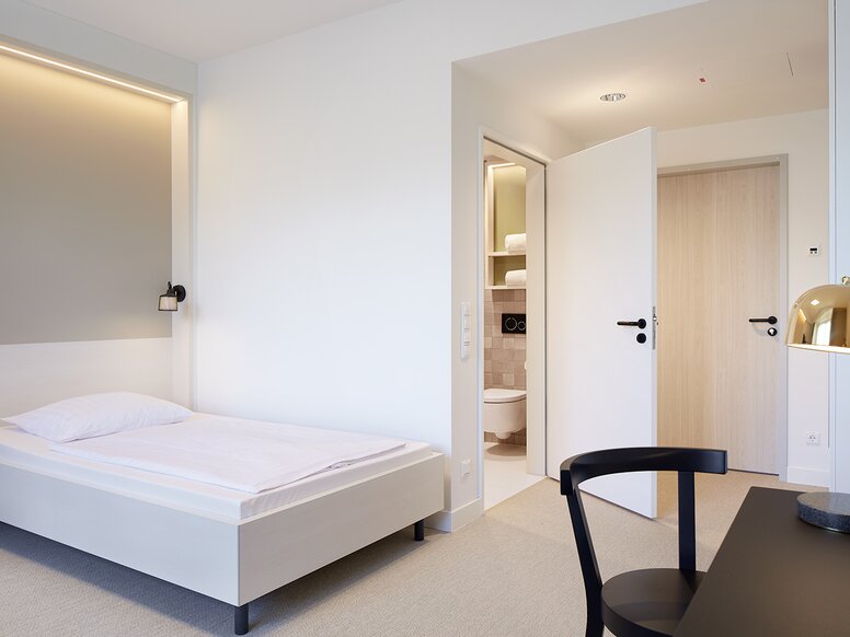 Op de kamerdeuren maakt de klassieke deurkruk van HEWI - Systeem 111 in een matzwarte afwerking - een statement. De tot de essentie teruggebrachte designtaal van de deurkruk past naadloos in de tijdloos moderne architectuur van het ziekenhuis en vormt tegelijkertijd een maximaal kleurcontrast met de witte deuren - soms in combinatie met een ronde WC- of sleutelrozet en in de optionele ruimtes met een elektronische sluitcilinder.
