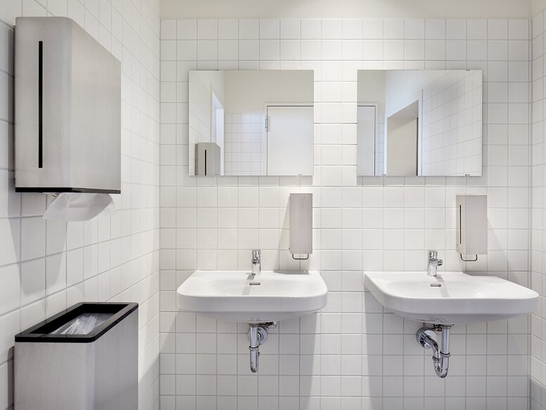 De dispensers voor papieren handdoekjes, papierafvalemmers en zeepdispensers in de serie 805 hebben ook een geïntegreerde vulpeilindicatie, die het gemakkelijker maakt verbruiksartikelen zoals zeep of zeepdispensers op voorraad te houden. Doordachte details zoals afsluitbare dispensers of verborgen bevestigingen beschermen tegen diefstal en vandalisme.