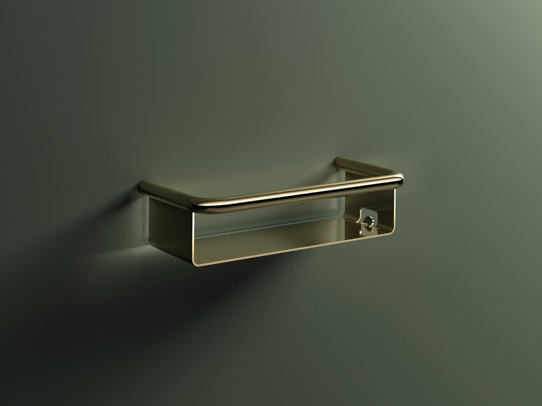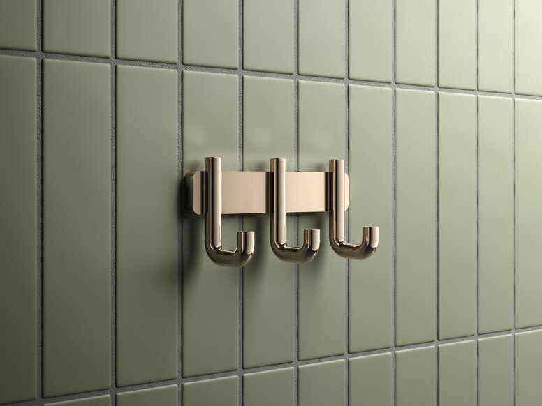 Een goed doordacht detail met architectonische helderheid: de drievoudige haak van de Serie 480 in glanzend messing creëert elegante orde en past harmonieus in veeleisende sanitaire ruimtes.