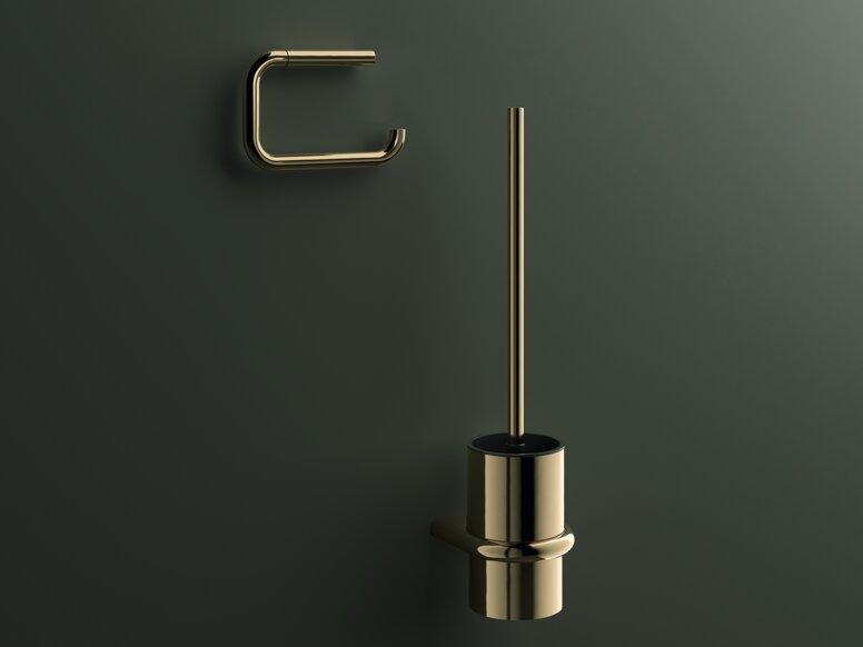 De wc-rolhouder en de wc-borstelgarnituur van de HEWI Serie 480 in glanzend messing bieden verfijnde designaccenten.