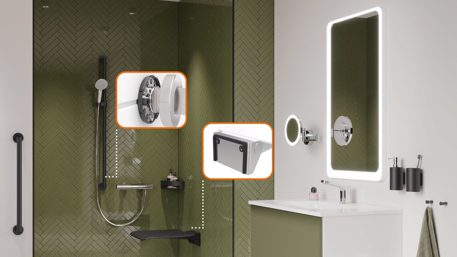HEWI afdichtingsrozetten passen zich bij de montage van draagsystemen en douchezitjes alsmede opklapbare steunklinken aan het betreffende oppervlak aan en dichten deze zo af dat water noch vocht kunnen binnendringen. Bij douchezitjes bieden naast de afdichtbandcomponenten ook de mini-afdichtschijven voor het afdichten van de boorpunten extra bescherming.