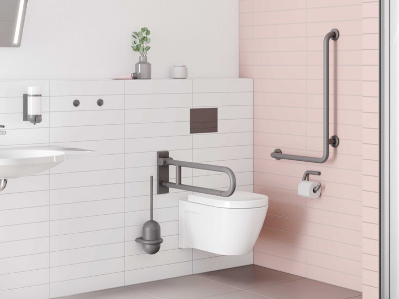 In openbare gebouwen (DIN 18040-1) en in appartementen voor rolstoelgebruikers volgens DIN 18040-2 (R) moeten opklapbare steungrepen rechts en links van het toilet worden geïnstalleerd. De bovenrand van de opklapbare steunbeugel moet 28 cm boven de zithoogte zitten. Een rugsteun is vereist op een afstand van 55 cm achter de voorste rand van de toiletpot. De toiletrolhouder en de spoelknop moeten met één hand of arm bereikt en bediend kunnen worden. Contactloze spoelactivering is ook mogelijk. Hieronder vindt u een overzicht van de installatieaanbevelingen voor toiletten en douches: