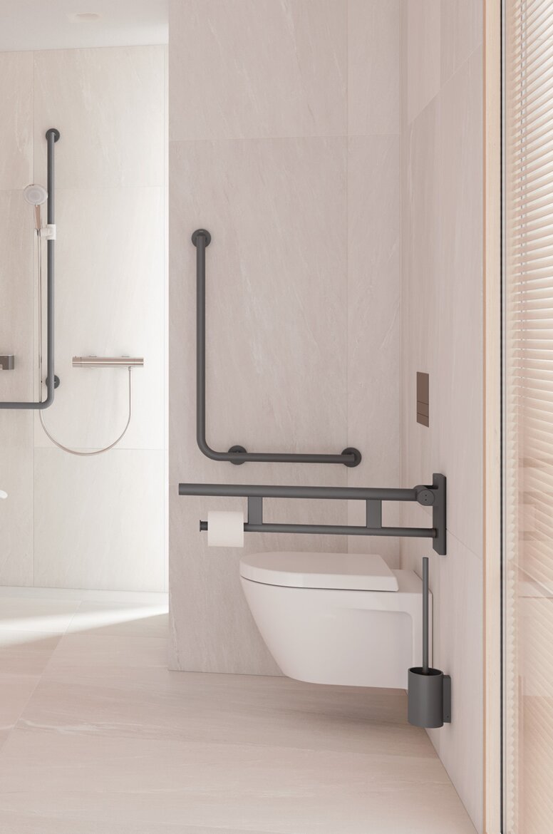 Inklapbare steunrails zijn noodzakelijk in barrièrevrije badkamers. Ze bieden belangrijke ondersteuning voor mensen met beperkte kracht en mobiliteit en verhogen de veiligheid in alle delen van de badkamer. Opklapbare steunrails worden bevestigd aan de wastafel, het toilet of de douche.